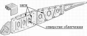 Наибольшее распространение получили нервюры, изготавливаемые штамповкой из листа. Края нервюр отгибаются для приклепывания к вертикальным стенкам и к обшивке. Избыточная прочность нервюры позволяет вырезать в ней отверстия облегчения. Для повышения устойчивости отверстия облегчения отбортовываются, а в стенке нервюры штампуются глухие канавки - зиги.