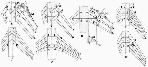 Различают стреловидные крылья с переломом осей продольных элементов по борту фюзеляжа (схемы а,б,ж) и с переломом в плоскости симметрии самолета, а также крылья без перелома осей силовых элементов - крылья с внутренней подкосной балкой (схема в).